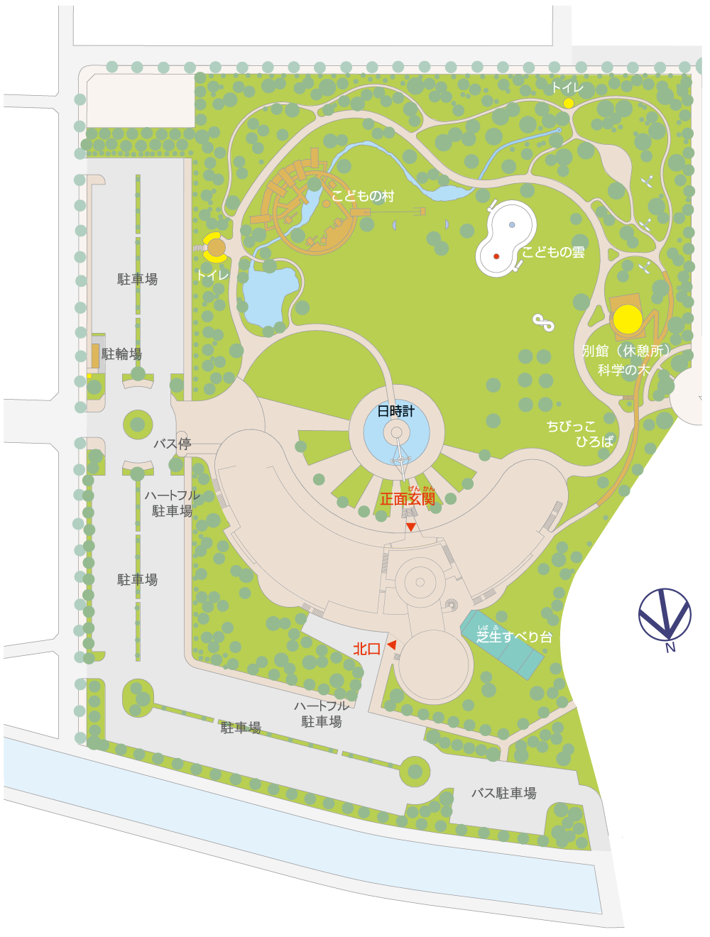 - 休館日や閉館後も利用できます。ただし、こどもの雲、噴水広場はお休みとさせていただきます。 なお、樹木や芝生の管理、遊具などの修繕のため、臨時に使用禁止とさせていただく場合があります。