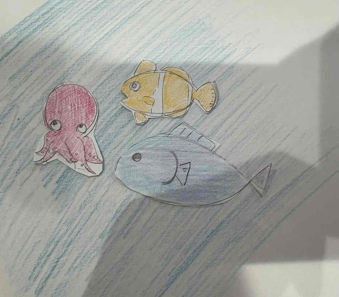 色鉛筆を使って海の生き物をお絵かきします。お絵かきした後は、会場内に展示します。