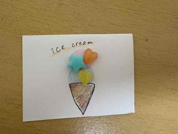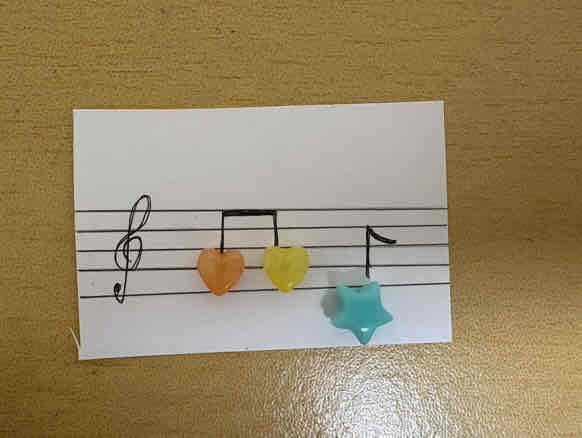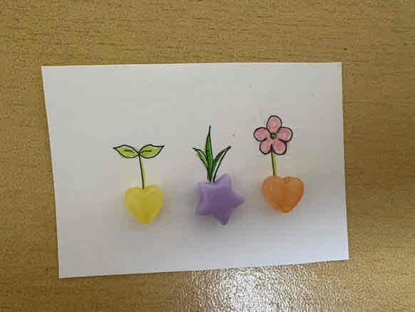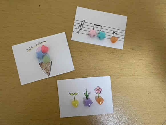 小さいキャンパスにビーズを飾って、マジックや色鉛筆でお絵かきします。