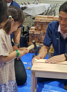 大工さんに教えてもらいながら、電動ドライバーを使ってサイドテーブルをつくります。