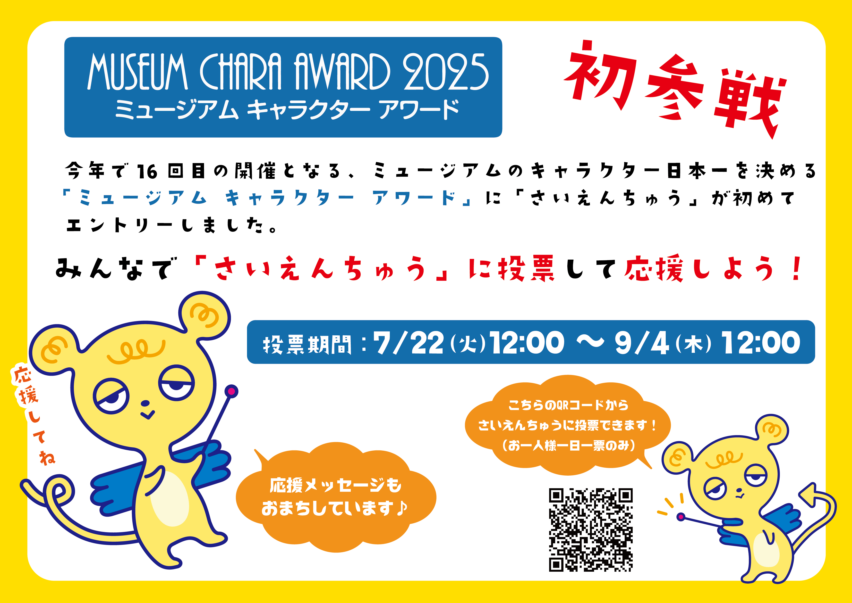 【投票受付終了しました】みんなで「さいえんちゅう」に投票して応援しよう!「ミュージアムキャラクターアワード2025」