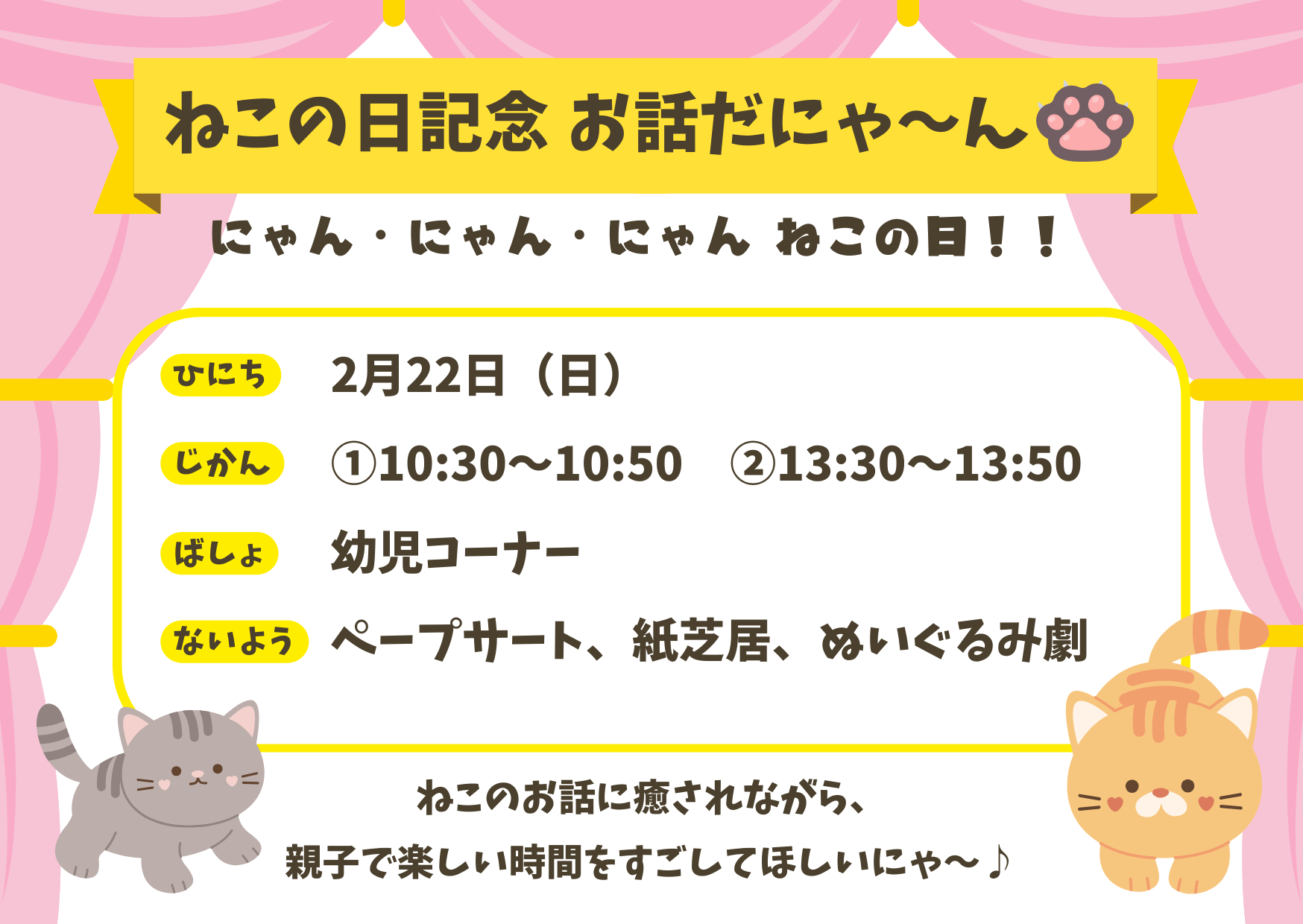 おしらせ2月22日(日)に「ねこの日記念 お話だにゃ~ん🐾」を開催します。
